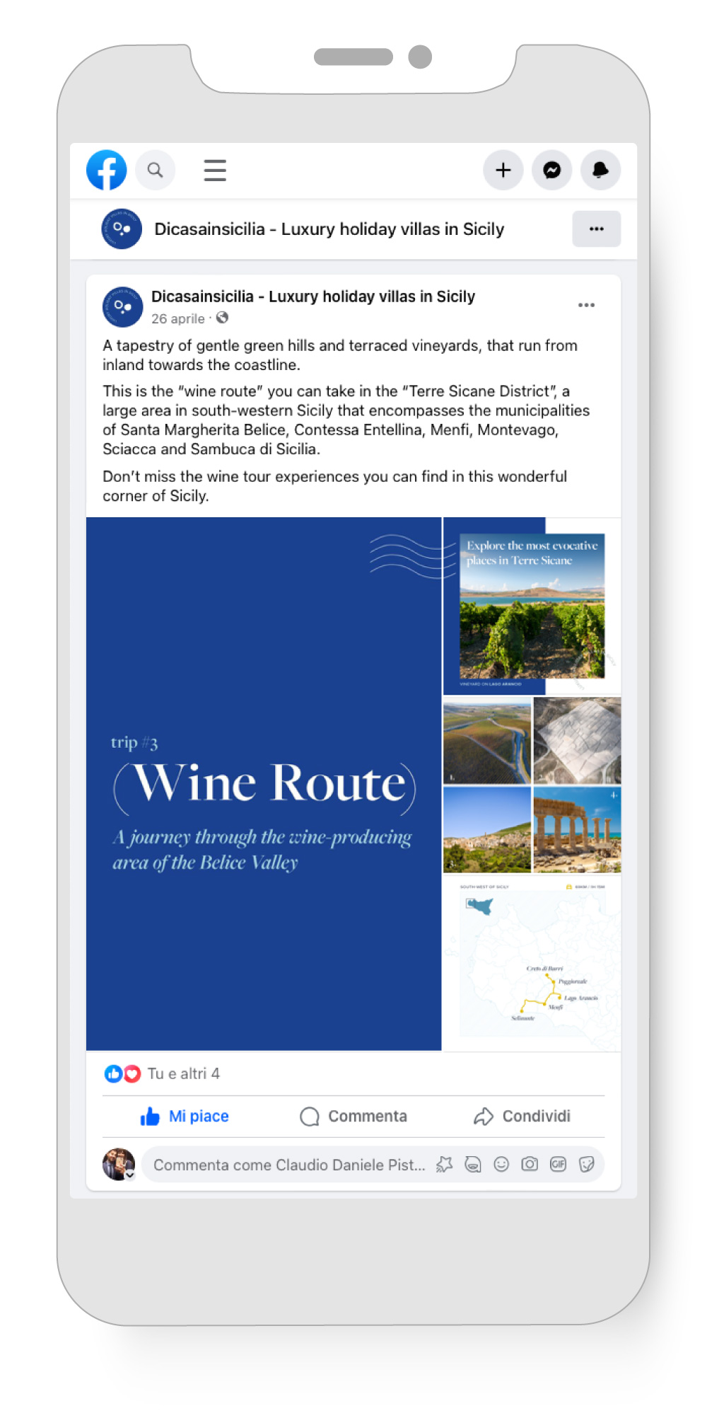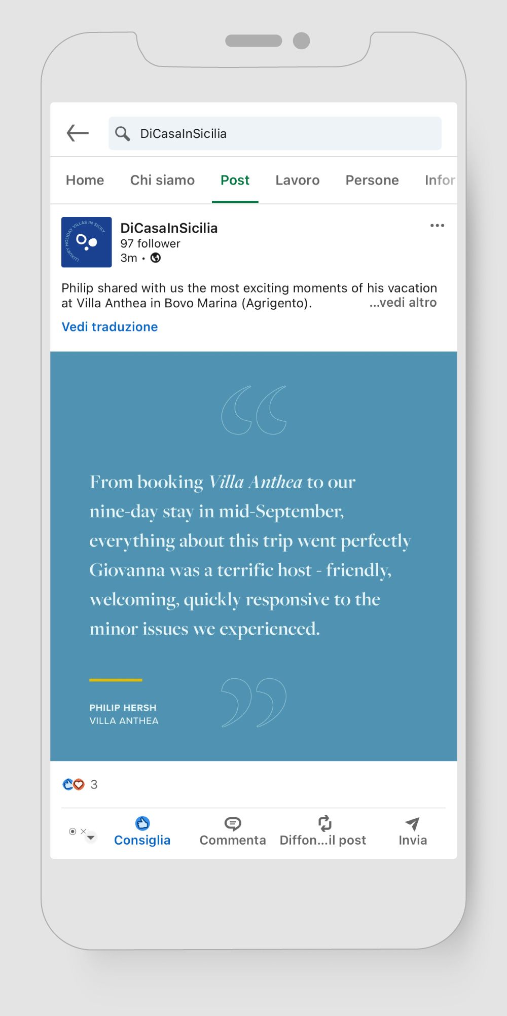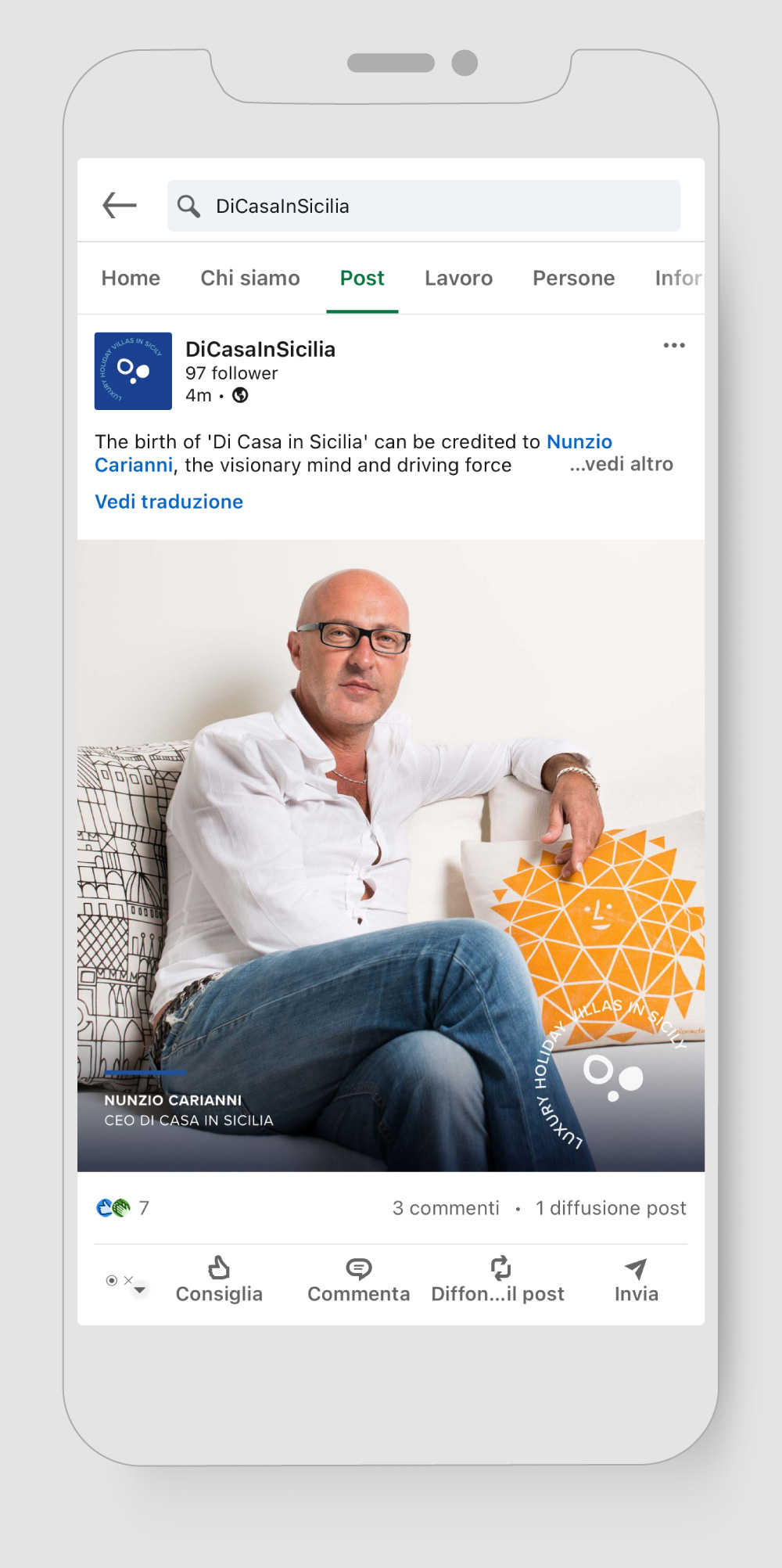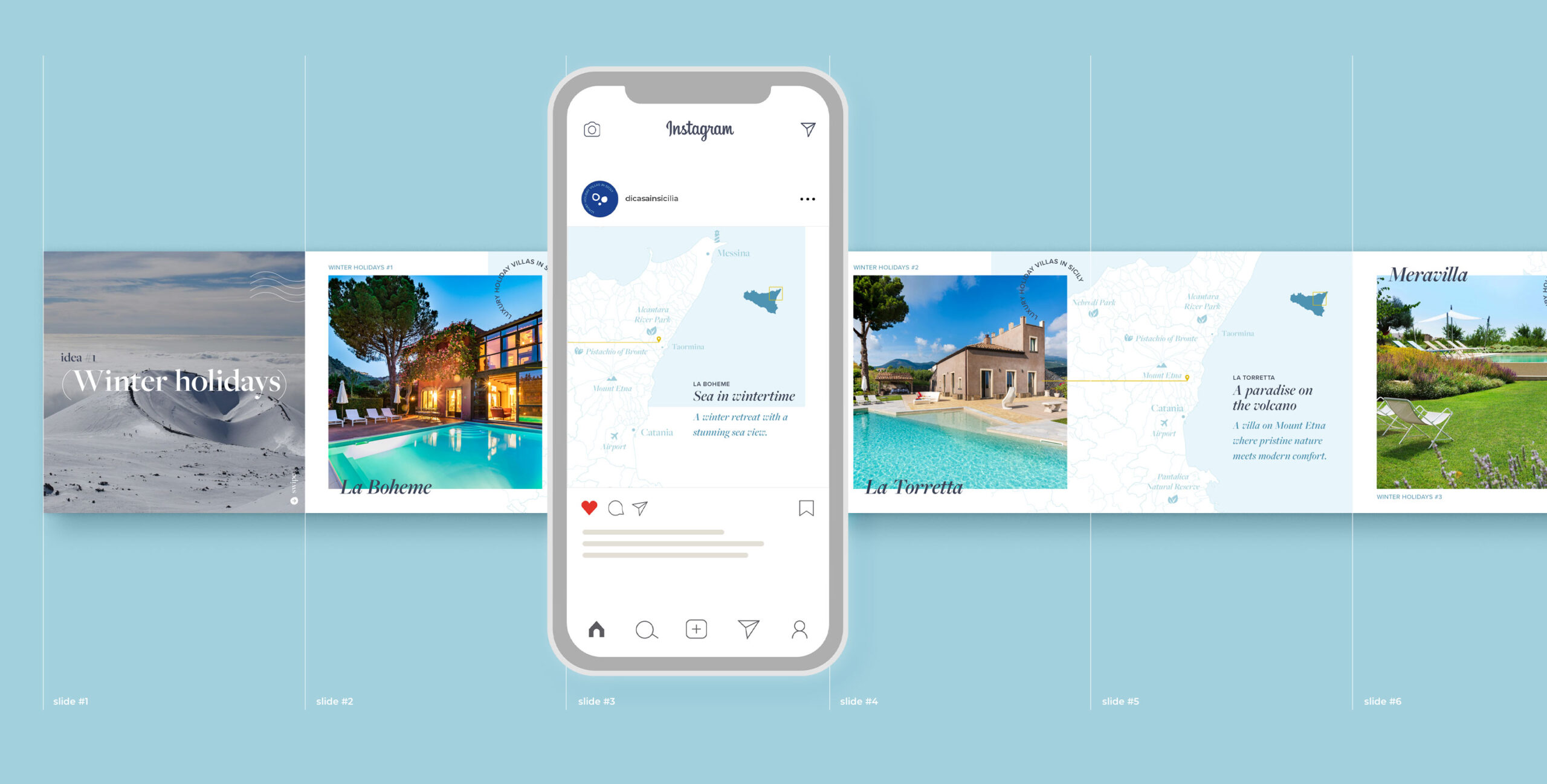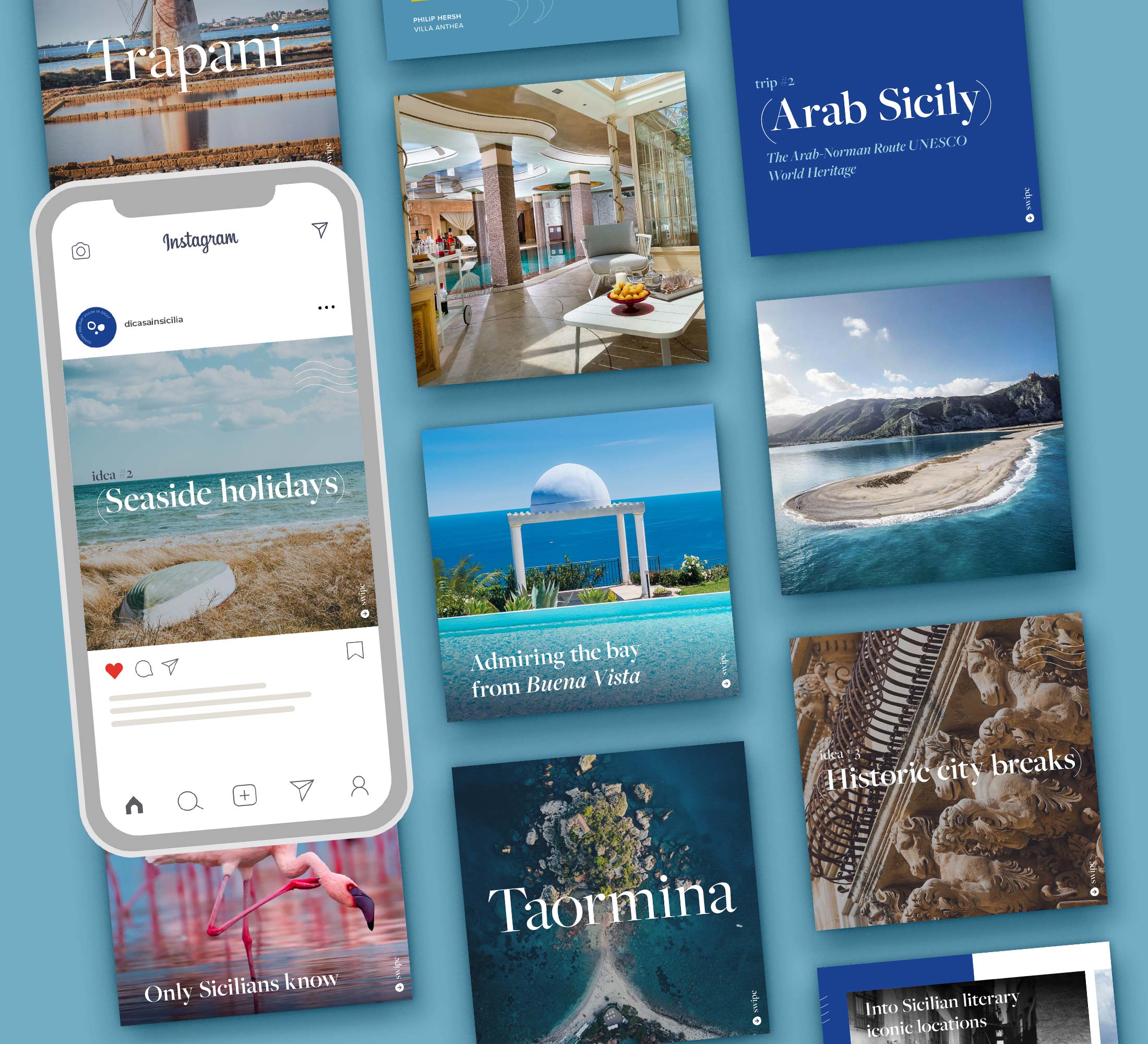 Dal 2024 ci occupiamo della strategia e gestione dei canali social per Di Casa in Sicilia, portale di prenotazione turistica che da più di 30 anni raccoglie il meglio dal panorama di Ville, Case e Appartamenti di lusso su tutto il territorio siciliano.